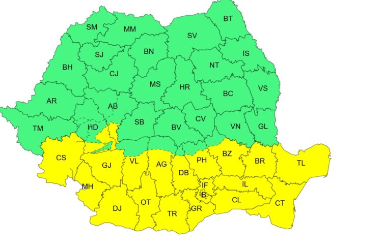 Potrivit ANM, primul Cod galben este în vigoare vineri, între orele 10:00 – 23:00, pentru aproape jumătate din țară. Vântul va avea intensificări în Oltenia, Muntenia, Dobrogea și sudul Banatului, cu rafale cuprinse între 50 și 70 km/h. În Munții Banatului și pe crestele Carpaților Meridionali, rafalele pot depăși 80 – 110 km/h.