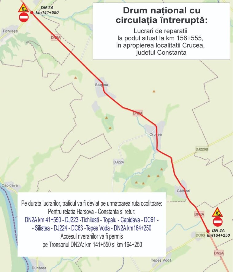 Pe durata lucrărilor, circulația rutieră rămâne închisă pe sectorul DN2A cuprins între kilometrii 141+550 și 164+250, iar rutele ocolitoare instituite anterior rămân valabile.