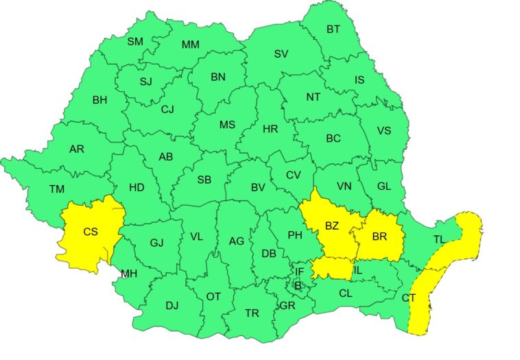 Pentru ziua de joi, 25 septembrie, între orele 7:00 și 21:00, ANM a instituit o atenționare Cod galben de vânt puternic în județele Caraș-Severin, Buzău, Brăila, vestul județului Ialomița, pe litoral, precum și în zone din județele Tulcea și Constanța, unde rafalele vor ajunge la 50 – 65 km/h.